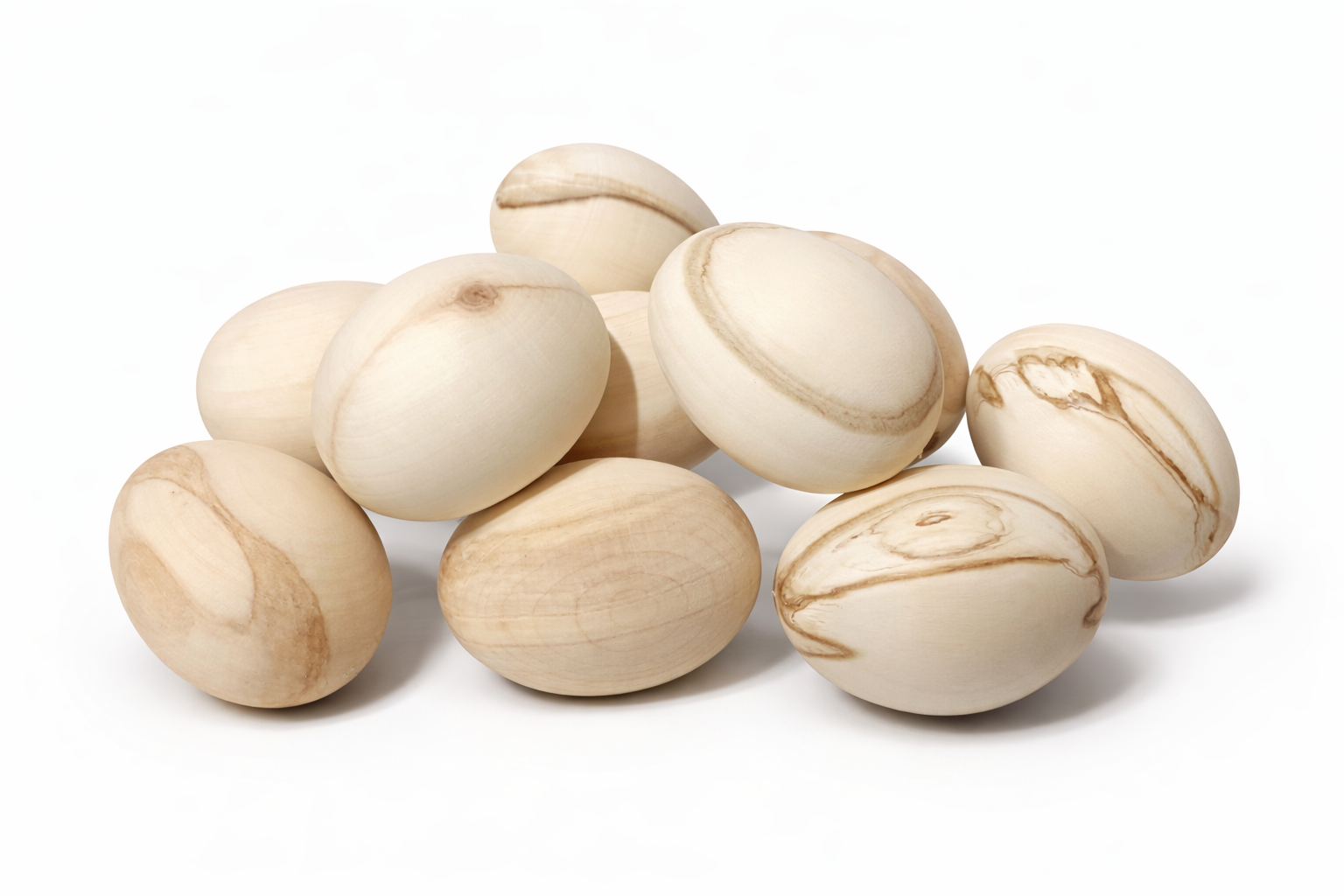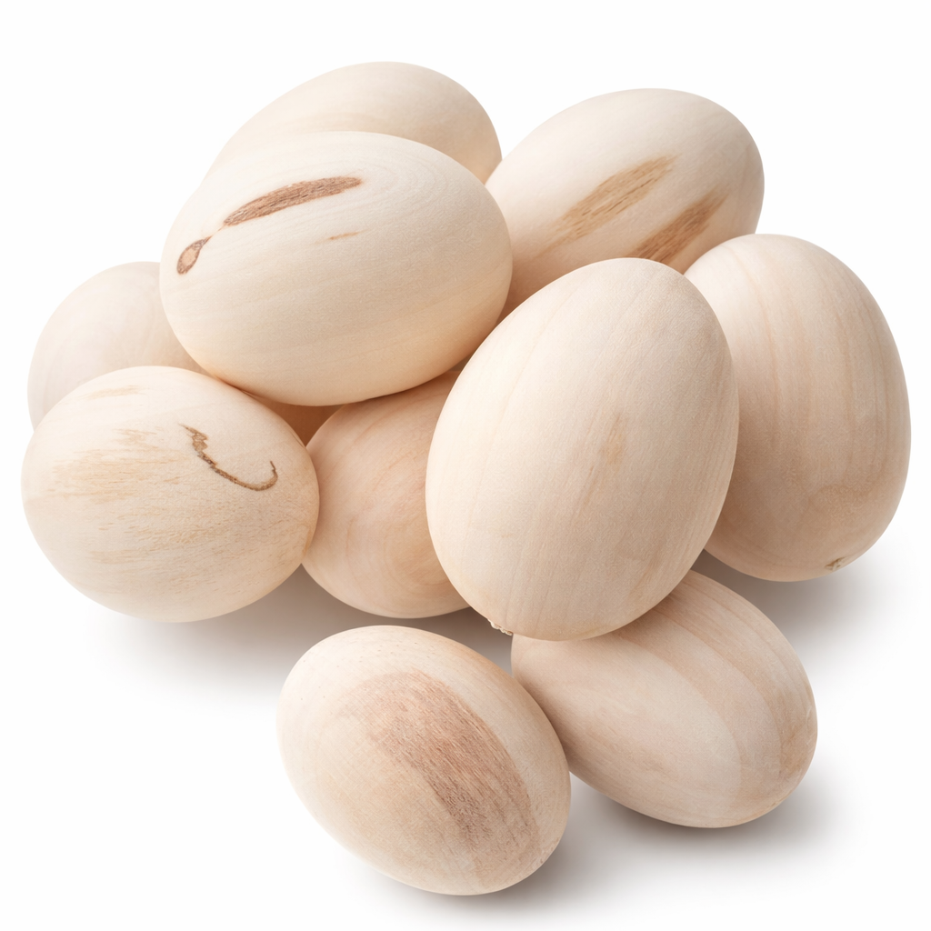 - Set de ouă din lemn natur, cu mici imperfecțiuni naturale (dungi sau pete închise), ideale pentru proiecte creative care implică culori intense sau tehnica decoupage.